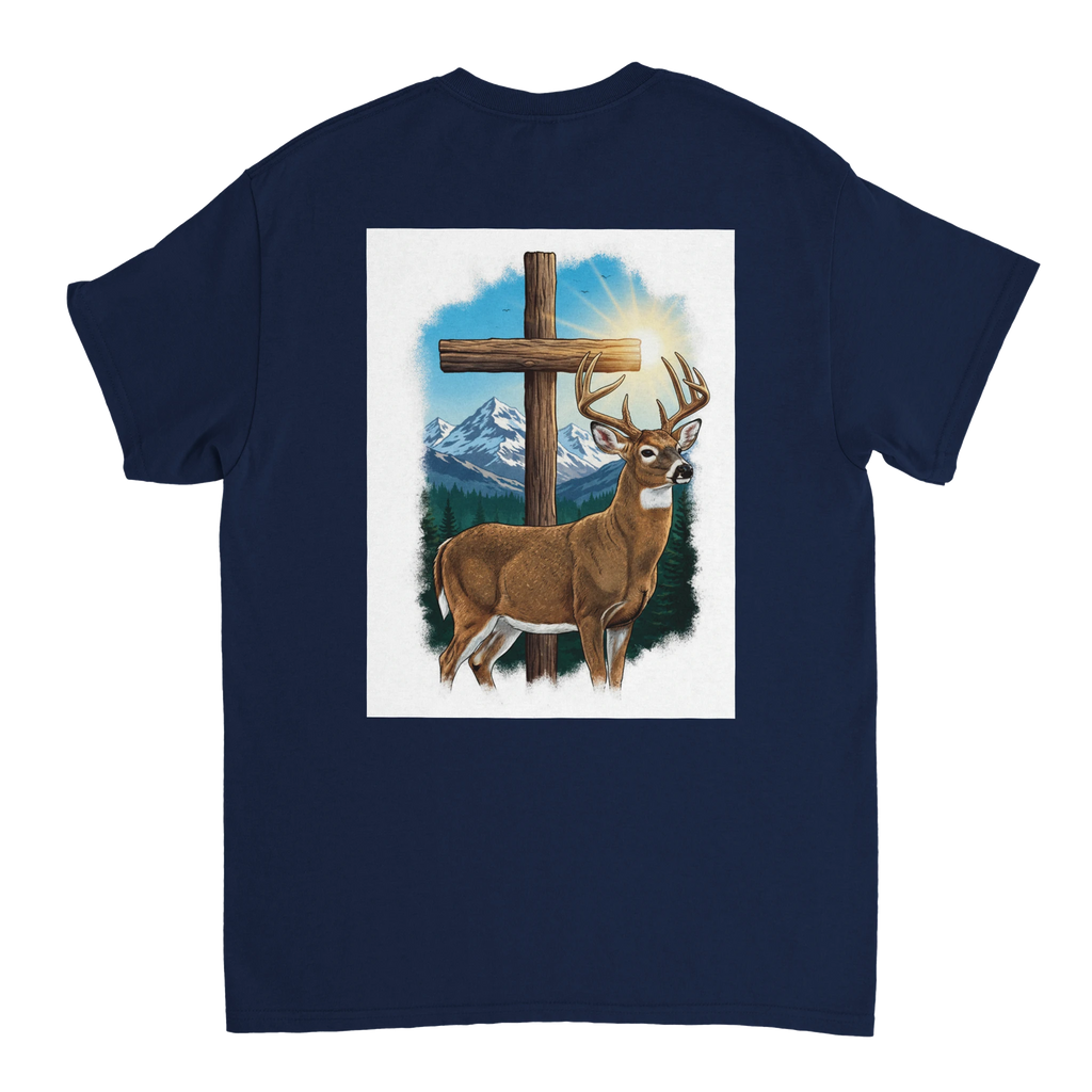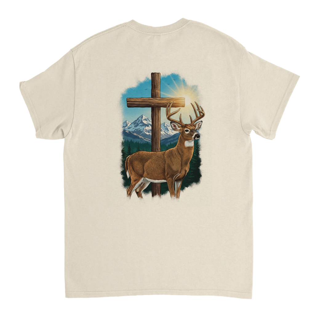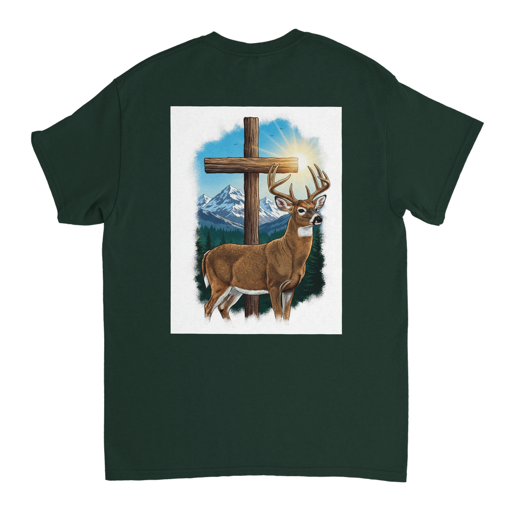 Celebrate the beauty of nature with the Scenic Buck Graphic T-Shirt, featuring a stunning illustration of a majestic buck set against the backdrop of towering evergreens and snow-capped mountains. This shirt not only highlights nature's grandeur but also incorporates a subtle silver cross detail, adding a spiritual touch to your wardrobe.