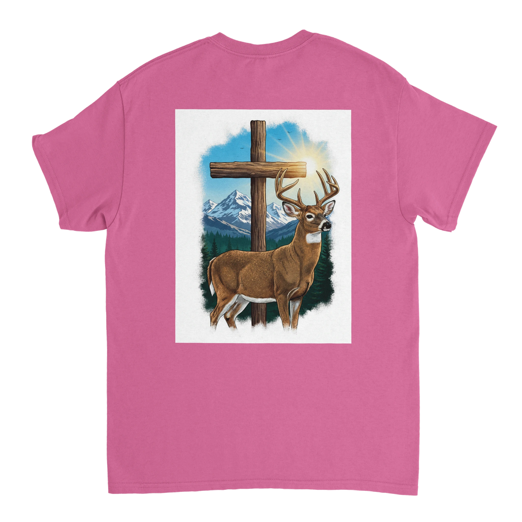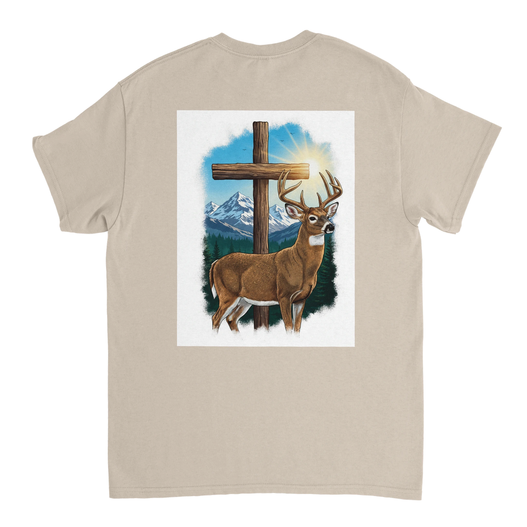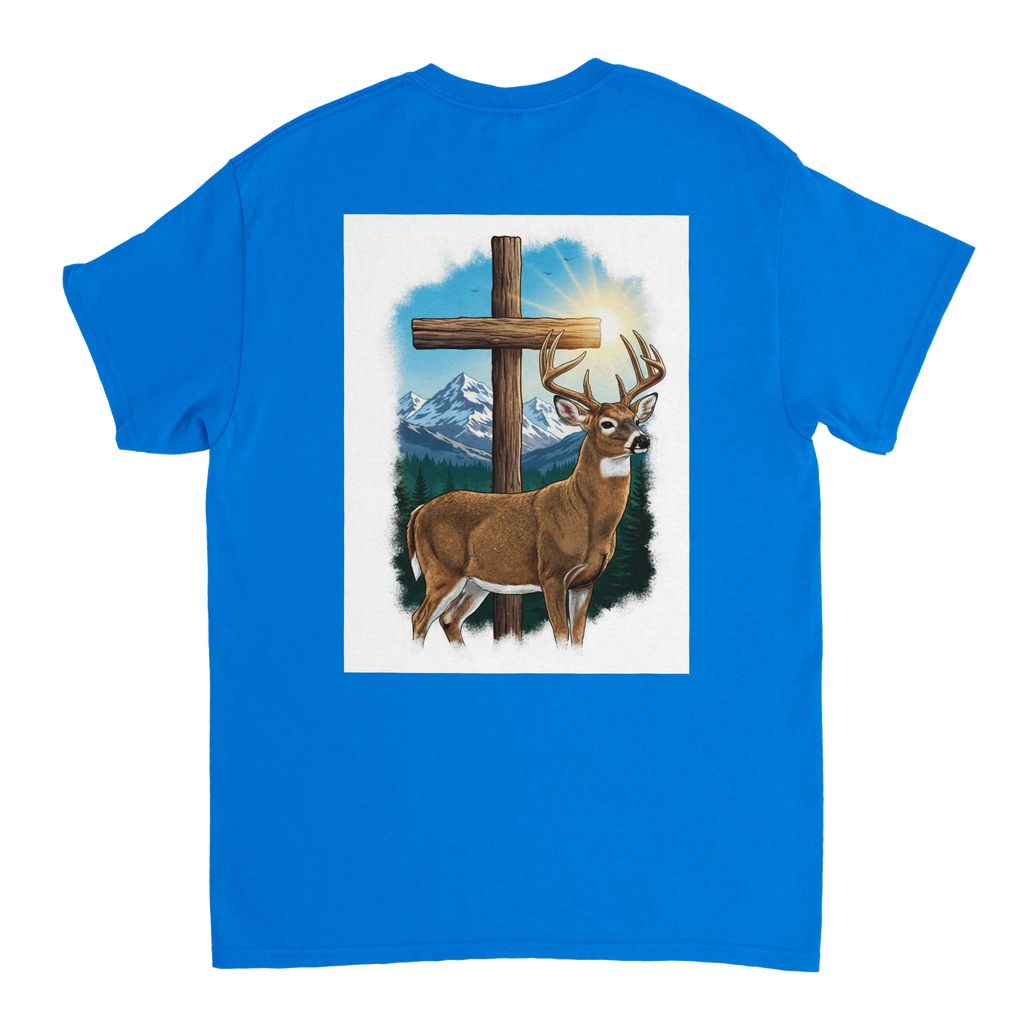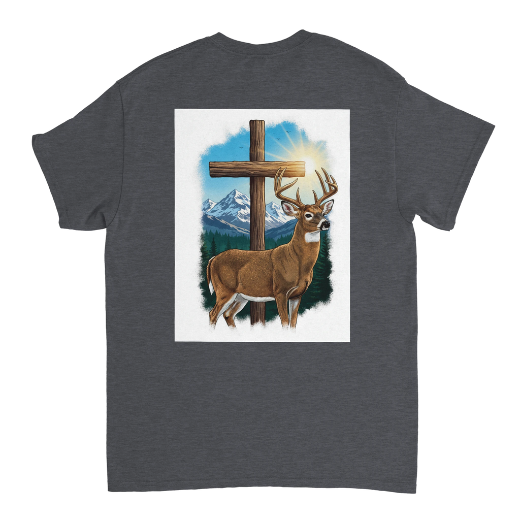 Celebrate the beauty of nature with the Scenic Buck Graphic T-Shirt, featuring a stunning illustration of a majestic buck set against the backdrop of towering evergreens and snow-capped mountains. This shirt not only highlights nature's grandeur but also incorporates a subtle silver cross detail, adding a spiritual touch to your wardrobe.